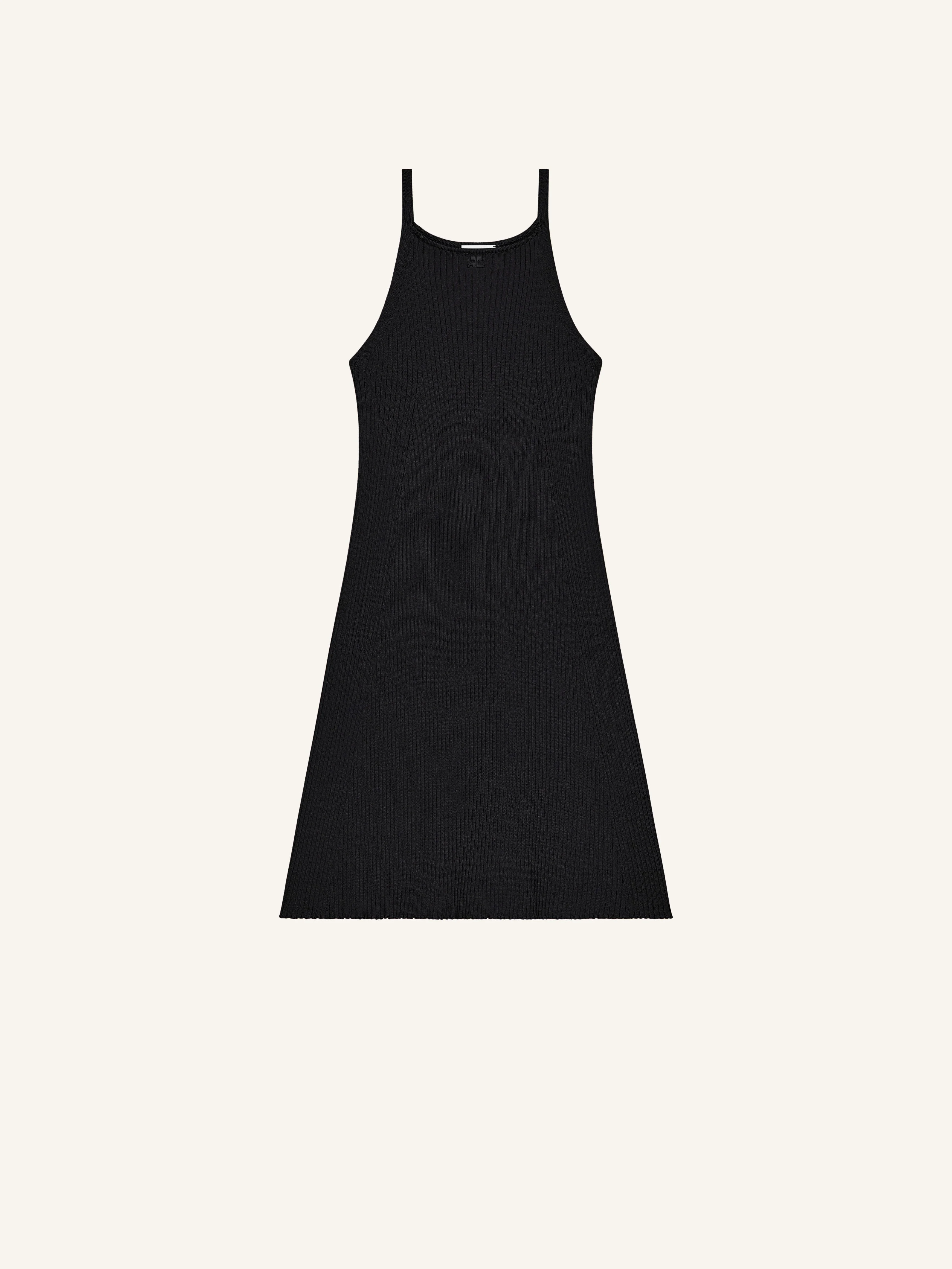 Short rib-knit A-line dress with thin straps and embroidered AC logo below neckline. The model is 1.79m and wears a size S. DETAILS Composition: 70% viscose , 30% polyester Country of Manufacture: BG SKU: 126MRO797FI00019999 Color: Black