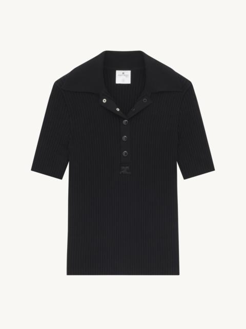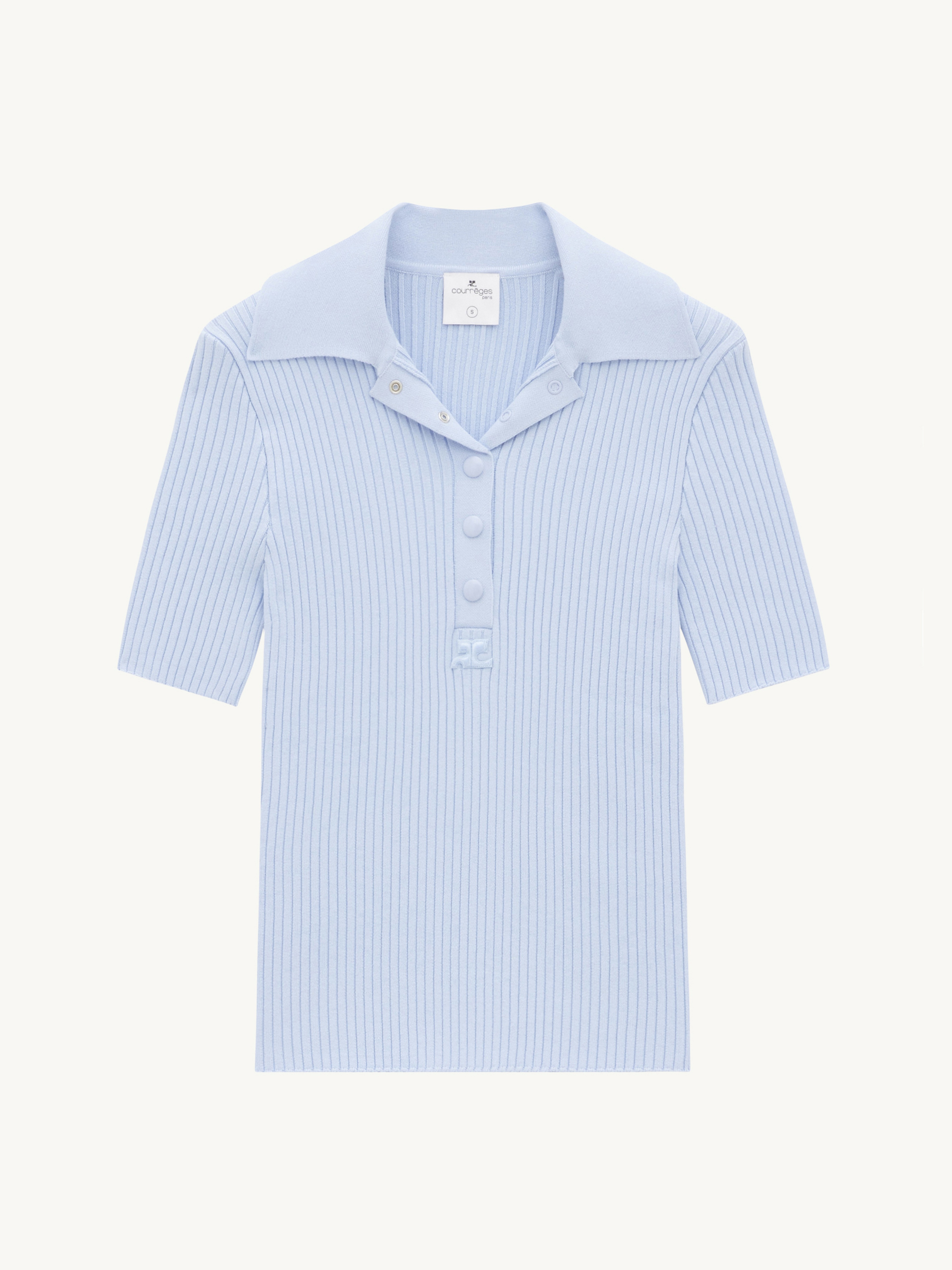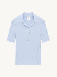 Rib knit short sleeves polo top with snaps and embroidered logo. DETAILS Composition: 70% Viscose 30% Polyester Color: Sky Country of manufacture: Bulgaria Item code: 123MPO017FI00017005