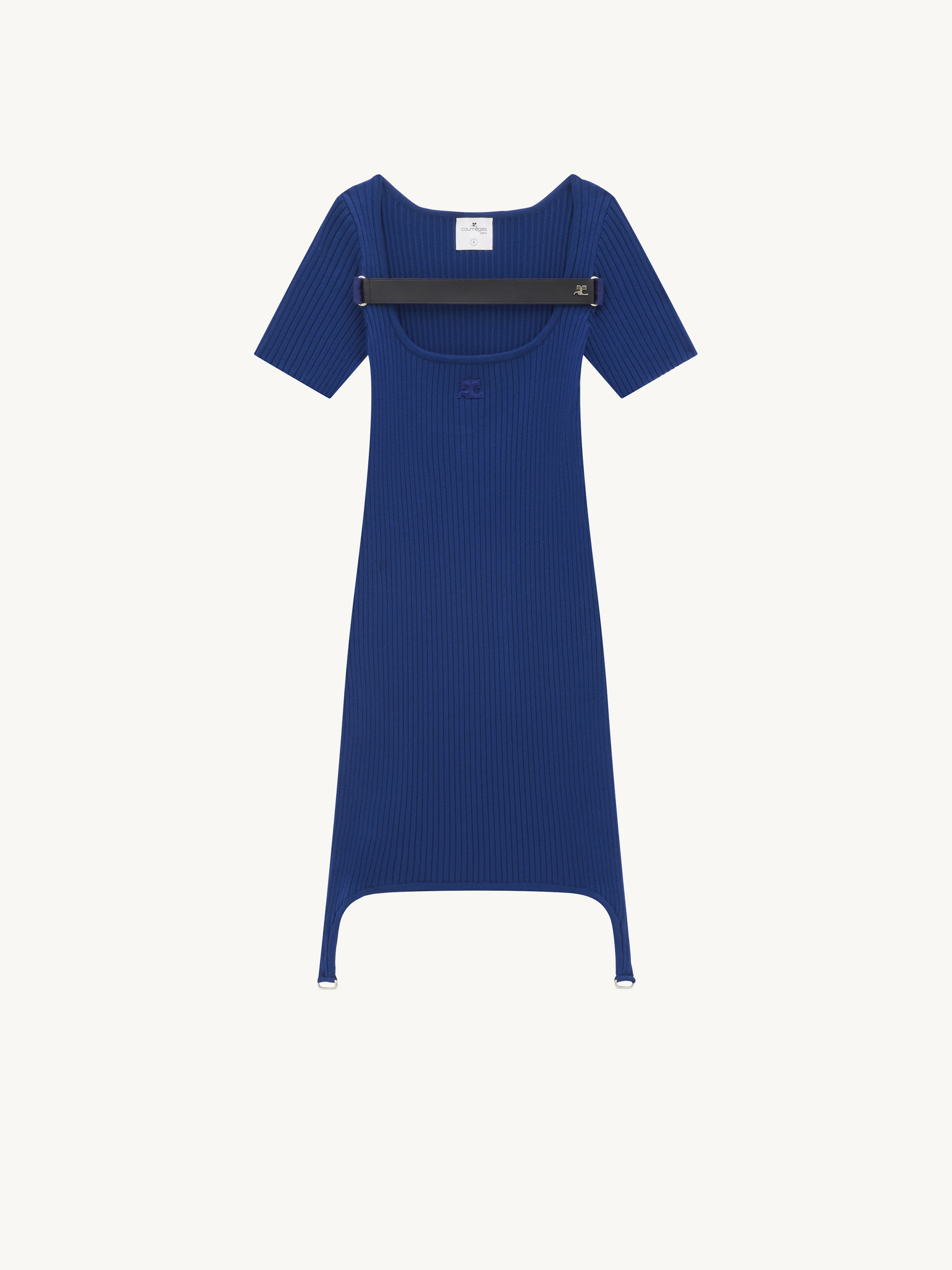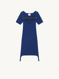 Rib knit short sleeves dress with metallic suspenders and strap. DETAILS Composition: 70% Viscose 30% Polyester Color: Ink Country of manufacture: Bulgaria Item code: 123MRO184FI00217077