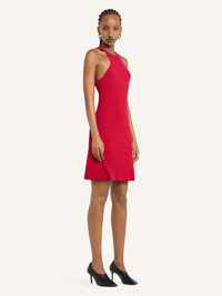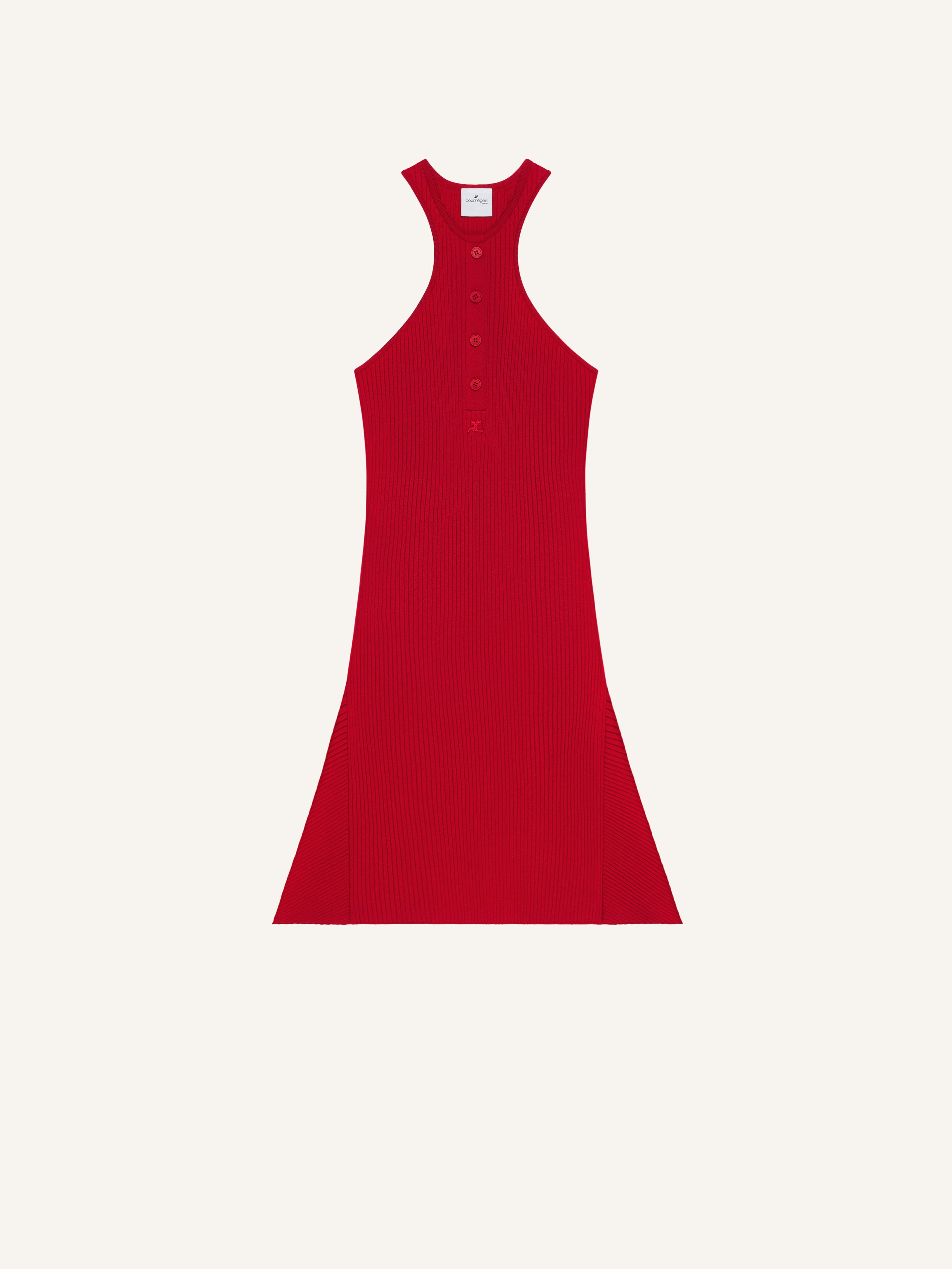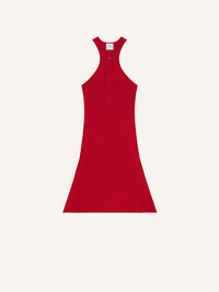 Sleeveless rib knit A-line short dress. Racer back, button-down placket with AC logo. The model is 1.75m tall and wears a size S. DETAILS Composition: 70% viscose, 30% polyester Country of Manufacture: BG SKU: 125MRO572FI00014015 Color: Ruby