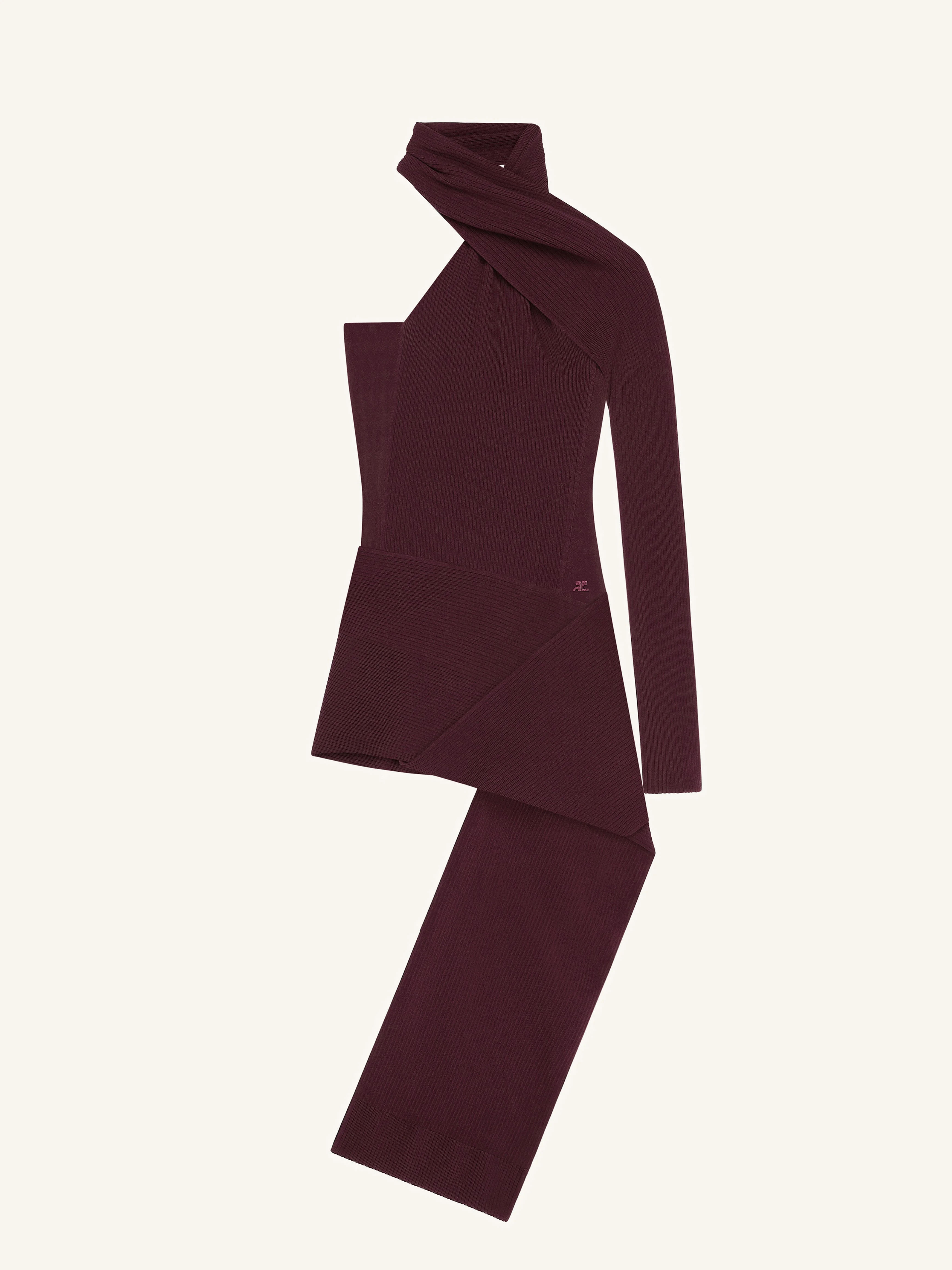 Asymmetrical ribben knit short dress with scarf collar and long back panel. Embroidered AC logo on front. The model is 1.78m tall and wears a size S. DETAILS Composition: 70% viscose, 30% polyester Country of Manufacture: BG SKU: 425MRO722FI00014010 Color: Burgundy