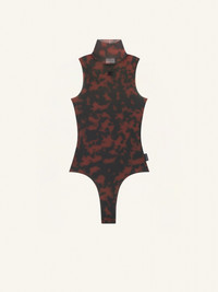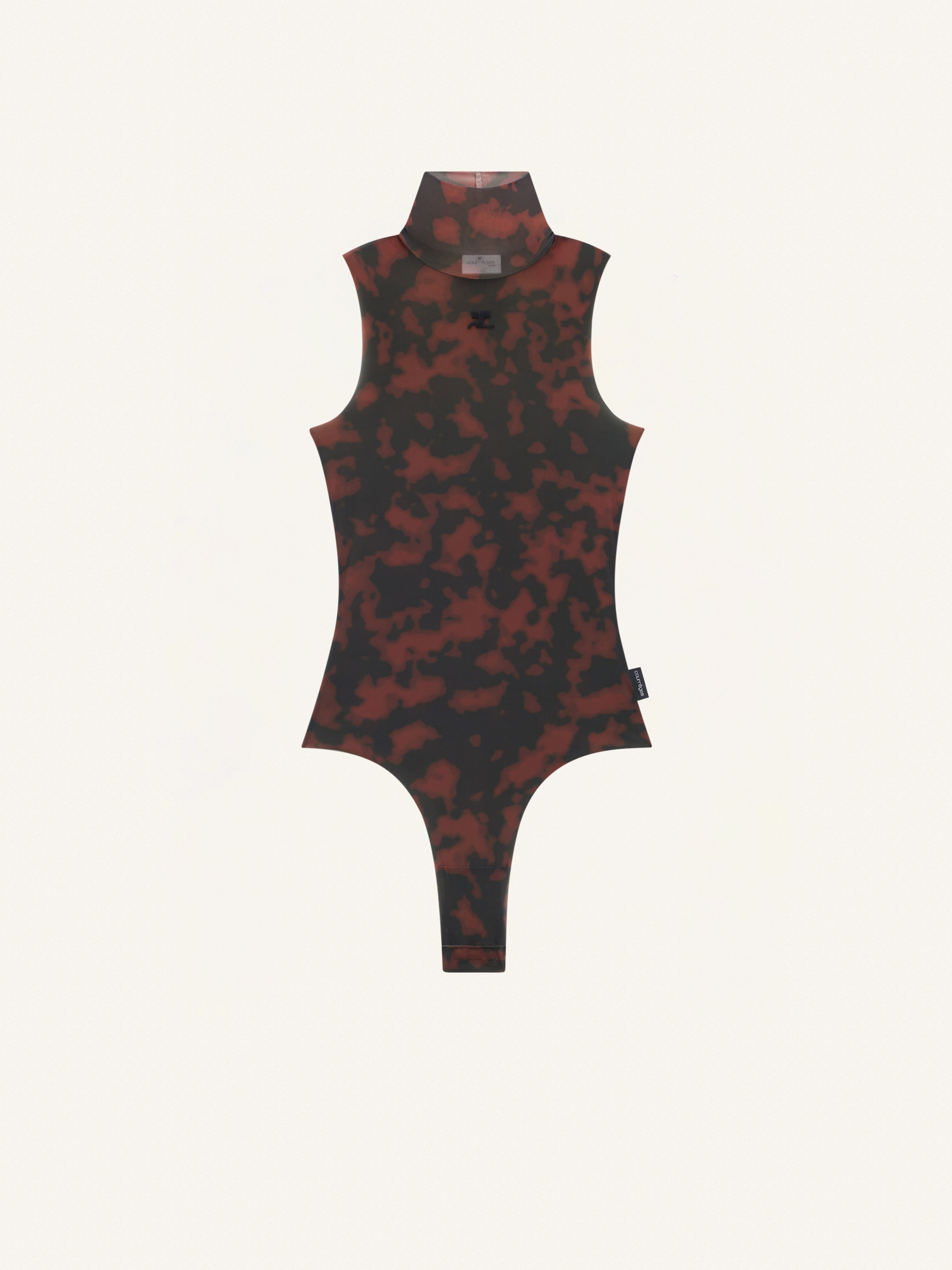 Second skin tortoise printed sleeveless fitted bodysuit with a mockneck collar and AC logo. DETAILS Composition: 84% Polyester 16% Elastane Country of manufacture: Italy Color: Havana/ Tortoise Item code: 323JBD049PR0031