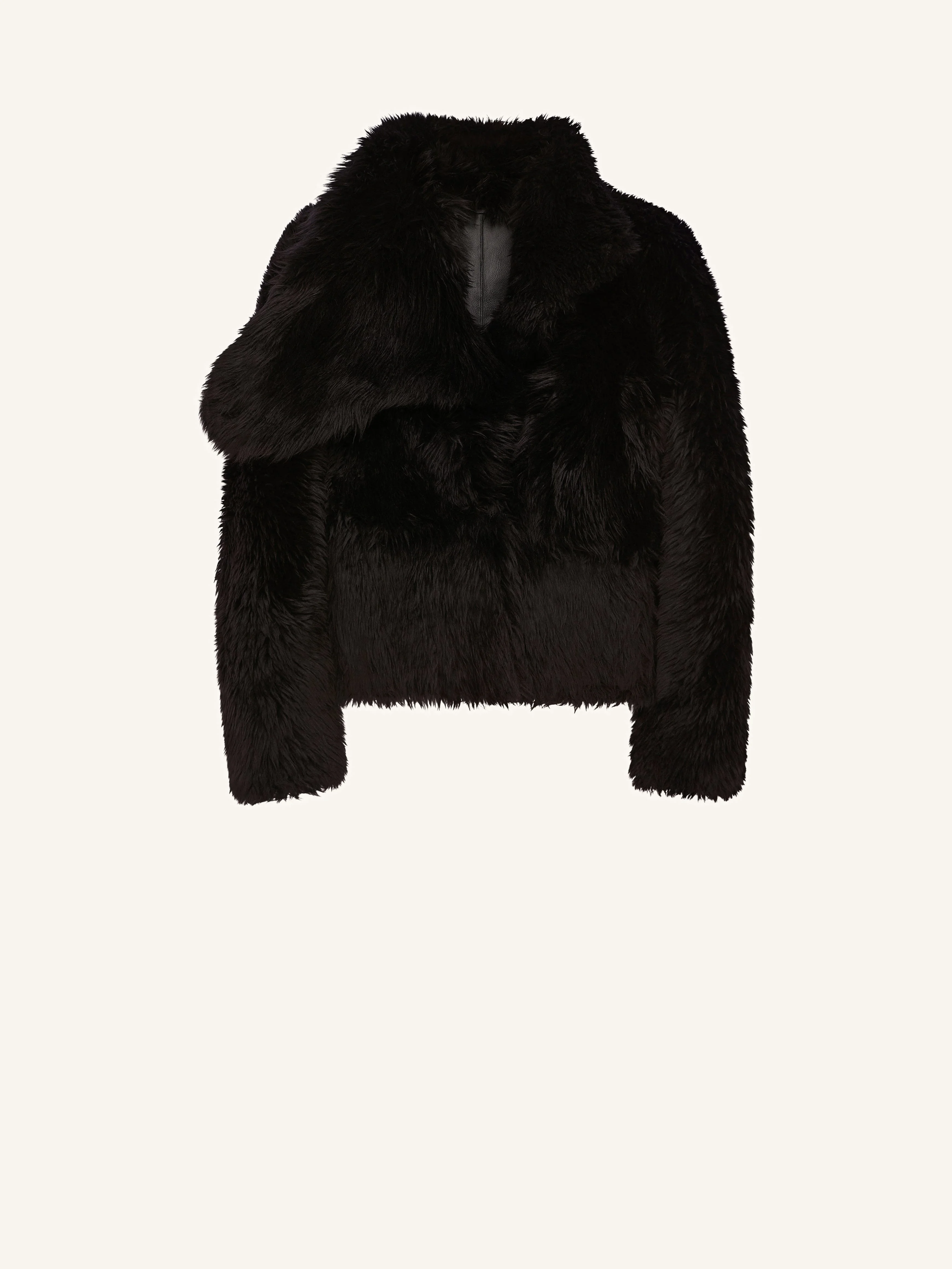 Short buttoned shearling coat with large collar and back belt. This item is unisex. The female model is 1.77m tall and the male model is 1.88m tall, both wearing size M. DETAILS Composition: 100% sheep leather Country of Manufacture: TR SKU: 325LMA239CM00059999 Color: Black