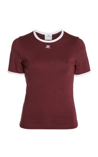 After 12 years alongside Nicolas Ghesquiere and a brief stint at Dior with Raf Simons, Courreges artistic director Nicolas Di Felice has brought the renowned French fashion house back to life. The label delivers their ‘Signature Contrast’ tee in burgundy jersey with a ‘Heritage White’ trim, and maintains its minimal slim fit. The colorway is guaranteed to work with a range of hues including classic denim blue. PRODUCT DETAILS - Fall/Winter ‘25 - Slip on - Composition: 100% cotton; Trim: 100% cotton - Dry clean - Designer Color: Burgundy/Heritage White - Imported