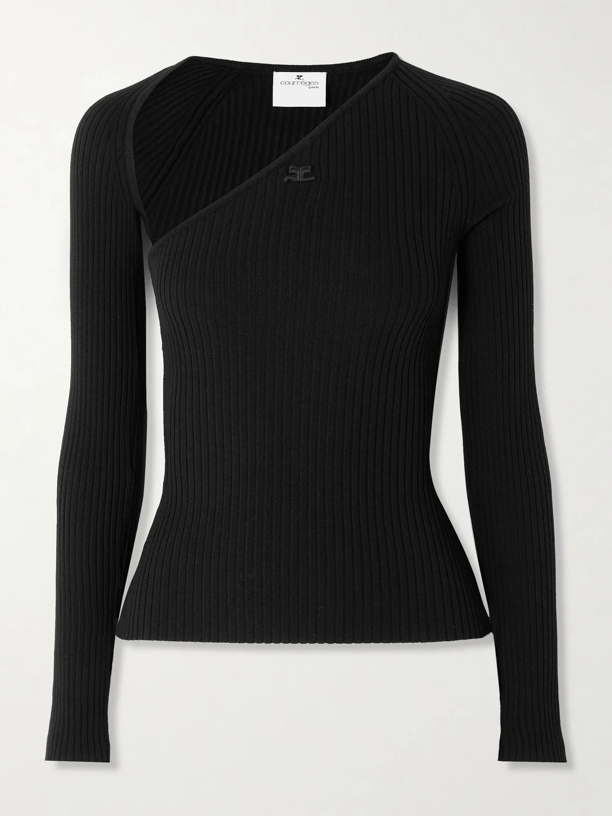 Courreges' sweater is artfully 'slashed' with an asymmetric neckline. Made from ribbed-knit, it clings closely to the body and has knuckle-grazing sleeves. The tight fit means you can seamlessly tuck it into pants and skirts.