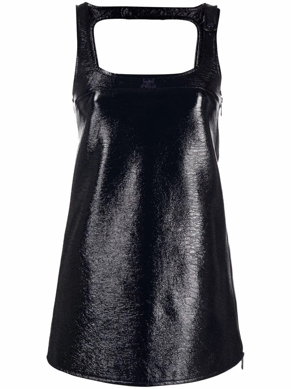 sleeveless vinyl mini dress Highlights - Navy blue - Vinyl - Square neck - Square open back - Sleeveless - Shift style Imported Composition Outer: Cotton 88%, Polyurethane 10%, Spandex/Elastane 2% Lining: Cupro 100% SIZE & FIT Model measurements Height 5 ft 10 in(1.78 m) Bust/Chest 33.07 in(84 cm) Hips 35.82 in(91 cm) Waist 25.98 in(66 cm) FittingInformation This piece fits true to size. We recommend you get your regular size Cut for a slim fit Made with a mid-weight fabric