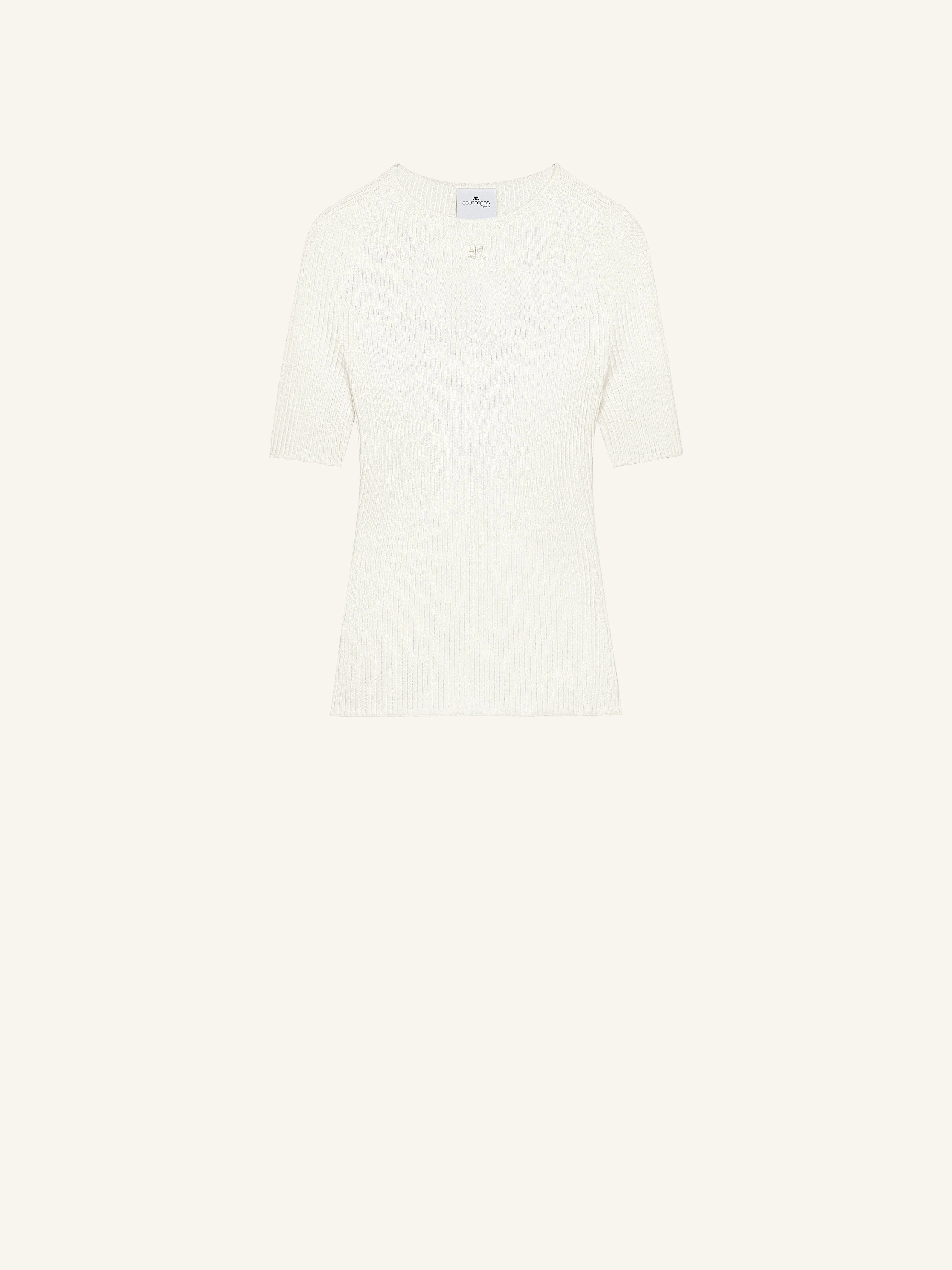 Short sleeved seamless knit sweater with a solar ribbed detail and AC logo below neckline. The model is 1.80m tall and wears a size S. DETAILS Composition: 80% cotton , 20% merino wool Country of Manufacture: IT SKU: 125MPU130FI00490001 Color: Heritage White