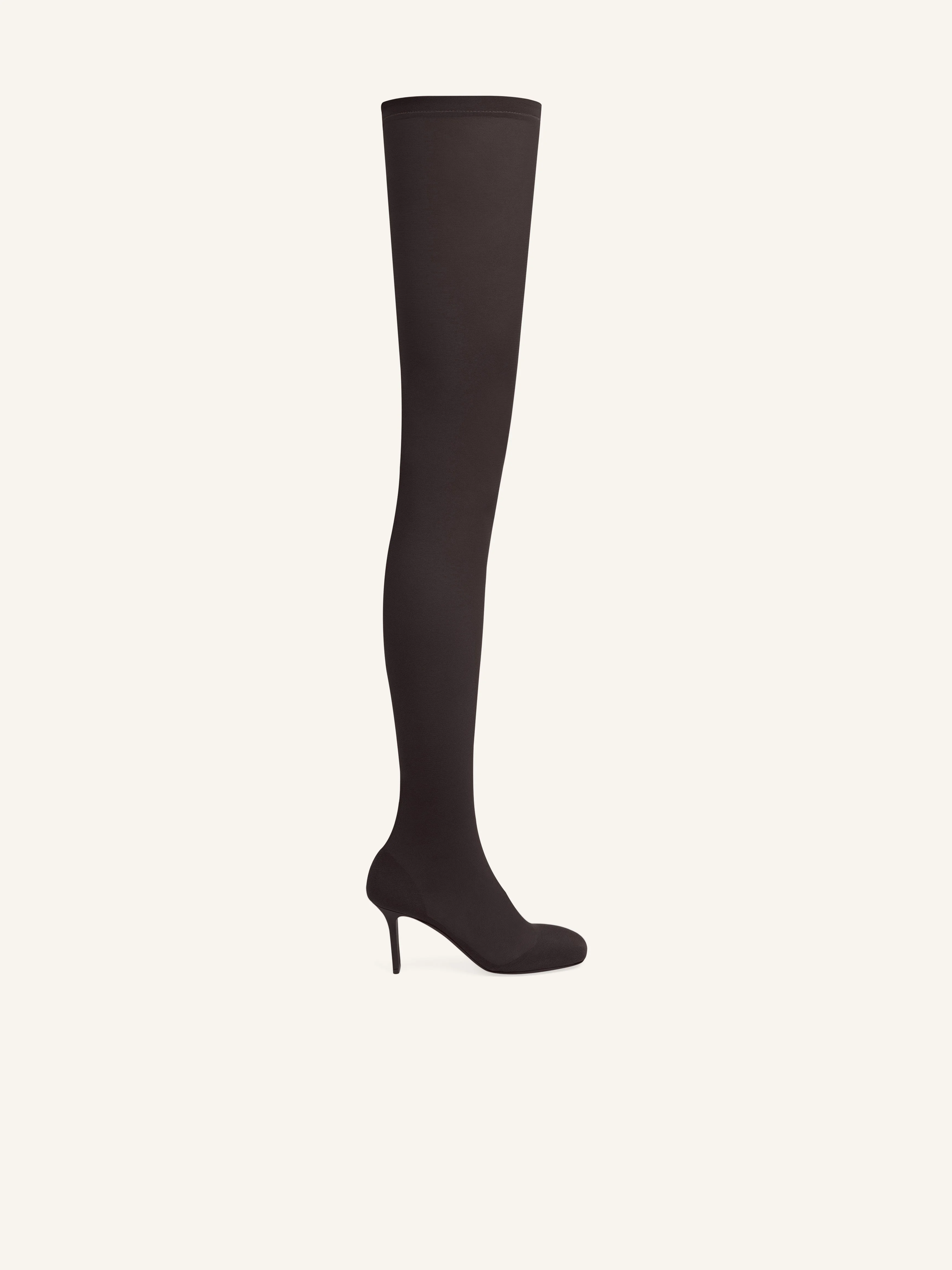 Square toe thigh-high mesh boots with Courreges logo on the heel. DETAILS Composition: 75% polyamide, 25% elastodiene Country of Manufacture: IT SKU: 425SKB067NY00391152 Color: Tapioca