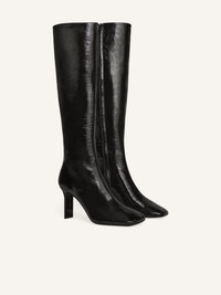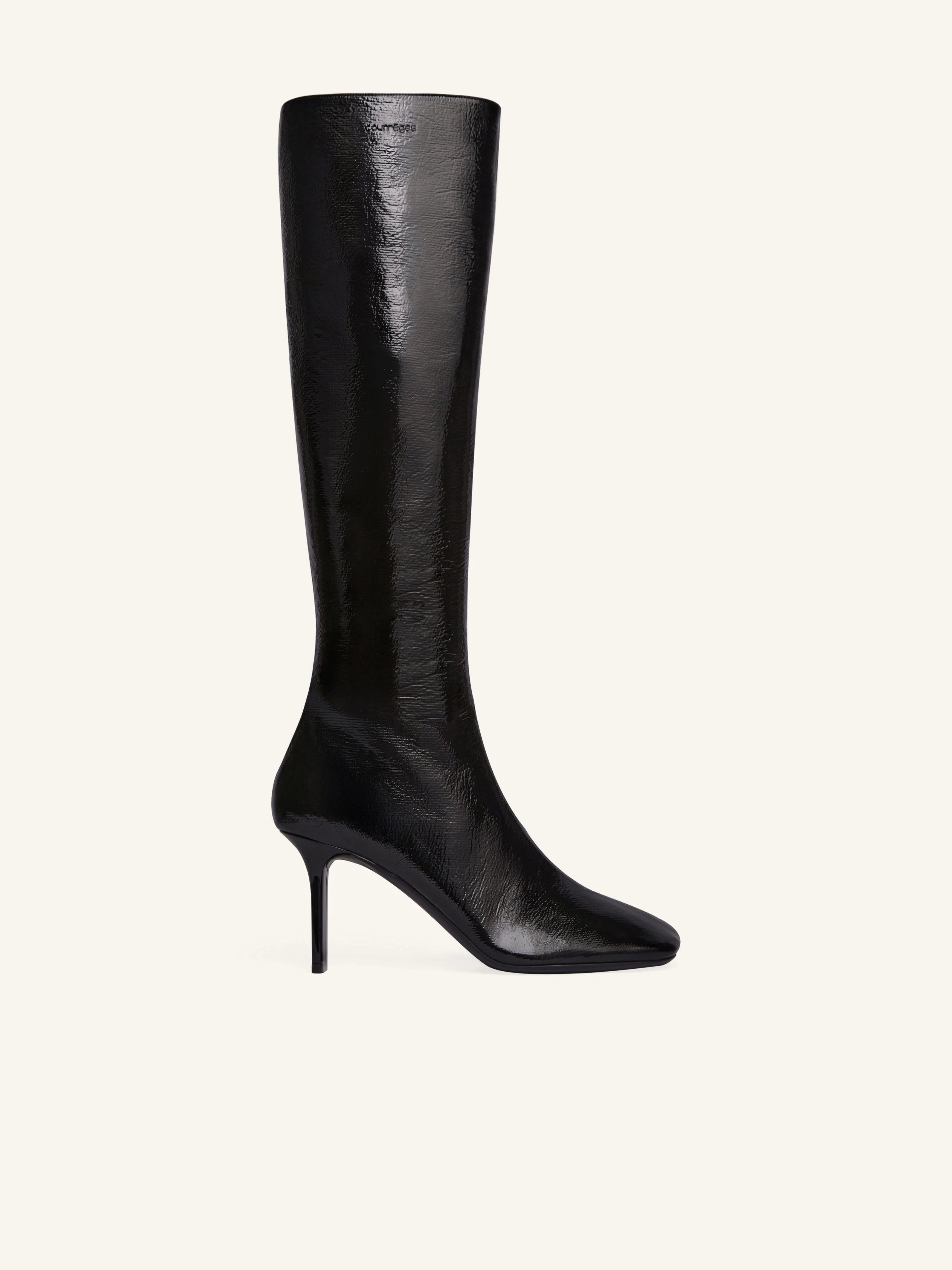 Square-toe vinyl boots. Knee-high with zip closure, lacquered heel with Courreges logo. Embossed Courreges logo on the side. DETAILS Composition: 88% cotton, 10% polyurethane, 2% elastane Country of Manufacture: IT SKU: 425SBT065VY00149999 Color: Black