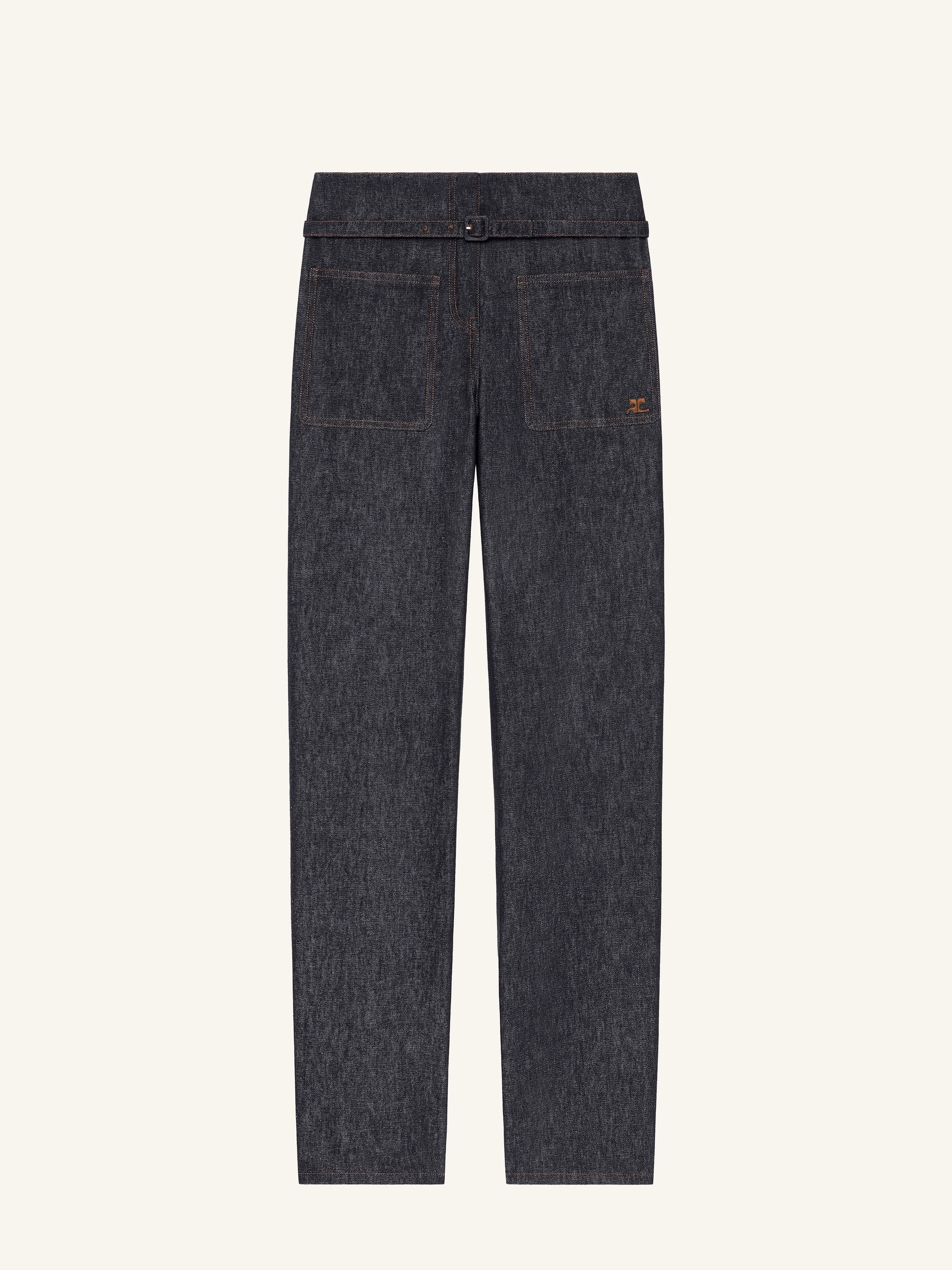 Denim straight pants with four patch pockets and embroidered AC logo. Adjustable belt and ‘Courreges’ logo on jacron label at the back. The model is 1.79m and wears a size 26. DETAILS Composition: 98% cotton, 2% elastane Country of Manufacture: IT SKU: 226DPA454DE0035M316 Color: Brut