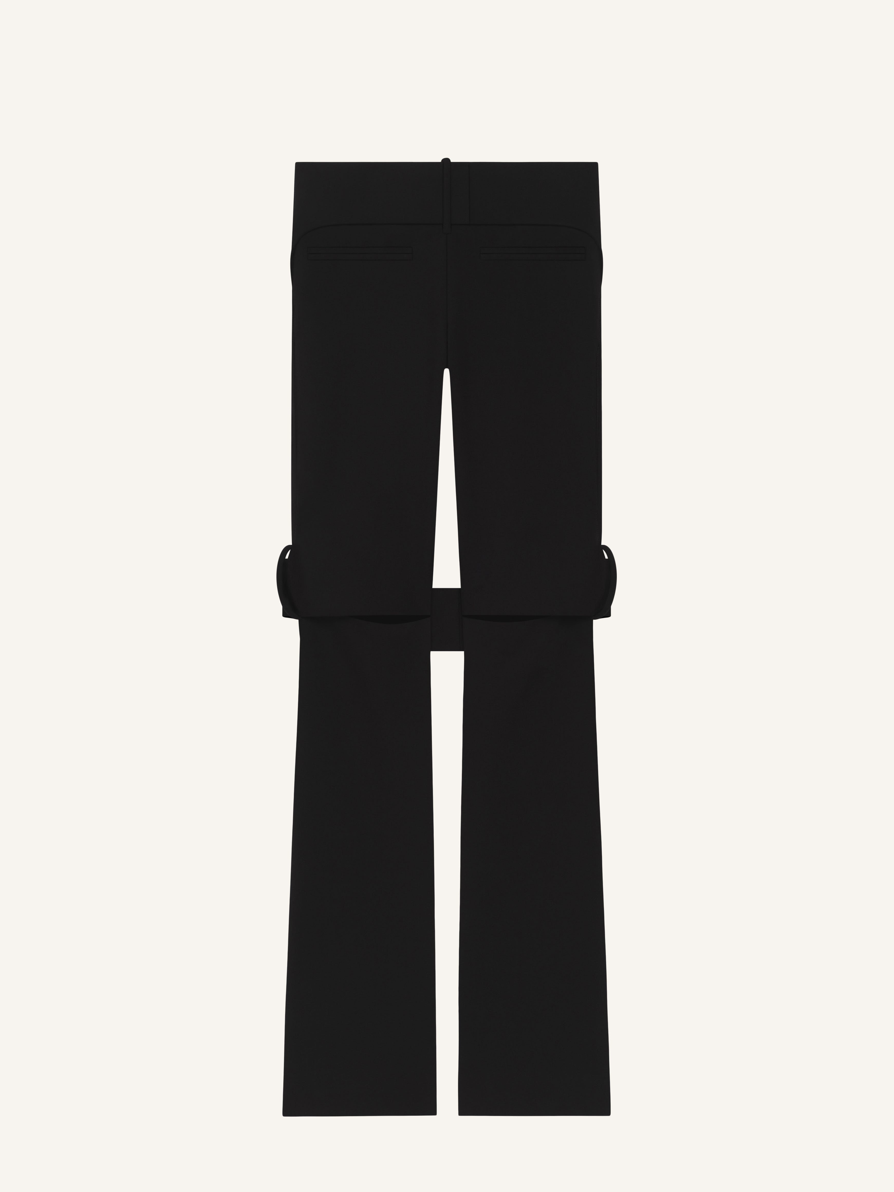 Polywool bootcut pants with integrated seasonal belt and detachable back strap. Front welt pockets and knee openings. The model is 1.75m tall and wears a size 36. DETAILS Composition: 51% polyester , 41% wool , 8% other fabrics Country of Manufacture: IT SKU: 225CPA392PL01709999 Color: Black