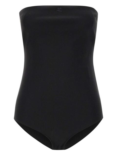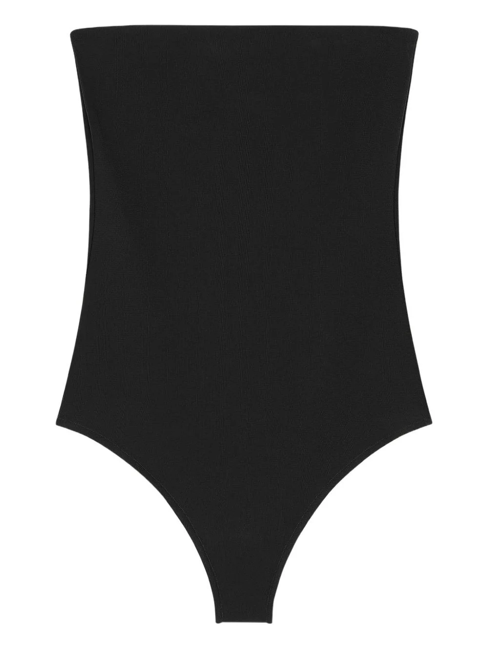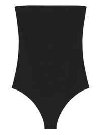 strapless button-fastening bodysuit Highlights - Black - Strapless neckline - Button detailing - Asymmetrical hem - Rear bra detail - Rear hook and eye fastening Made in Italy Composition Viscose 86%, Polyamide 14% Washing instructions Read Manufacturer Guidelines