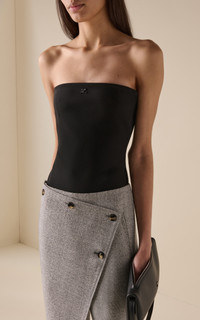 After 12 years alongside Nicolas Ghesquiere and a brief stint at Dior with Raf Simons, Courreges artistic director Nicolas Di Felice has brought the renowned French fashion house back to life. This strapless bodysuit features a slim, form-fitting silhouette with a sleek front and an adjustable mesh strap at the back. Style it with tailored trousers or high-waisted denim for a clean look. PRODUCT DETAILS - Fall-Winter '25 - Zip Fastening Through Back - Composition: 86% Viscose 10% Polyamide/Nylon 4% Elastane 79% Polyamide/Nylon 21% Elastane 92% Polyester 8% Elastane - Dry Clean Only - Made in France