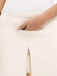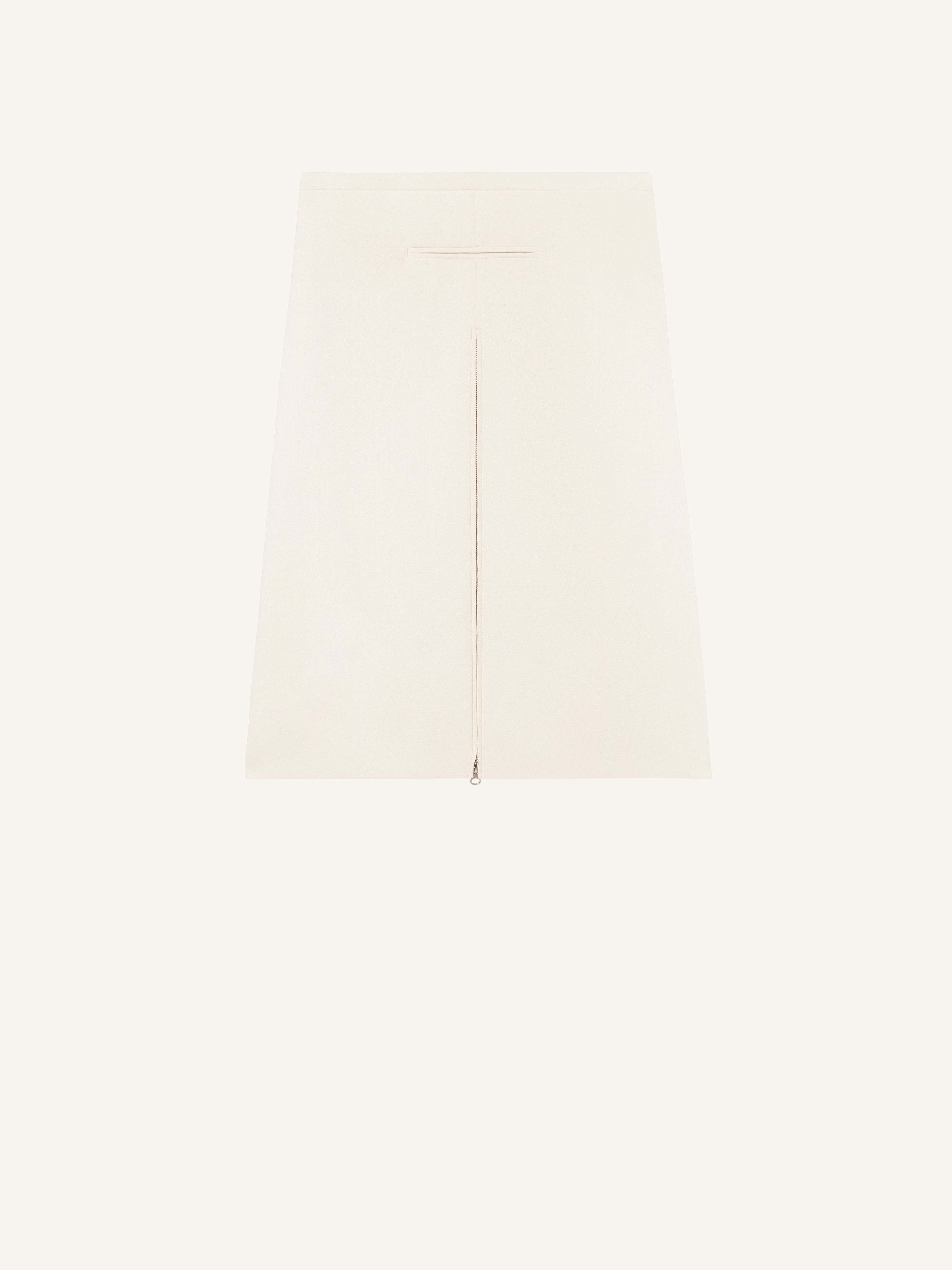 Crepe tailored midi skirt with a welt pocket and long zip opening centered at front. The model is 1.75m tall and wears a size 36. DETAILS Composition: 100% polyester Country of Manufacture: RO SKU: 324CJU181PL00520079 Color: Natural Beige