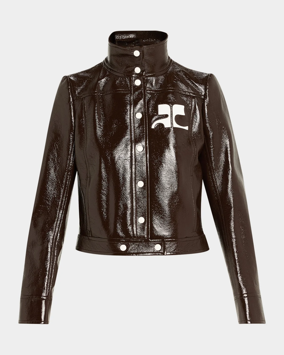 Courreges textured vinyl jacket featuring contrast logo patch chest Part of the Iconic vinyl collection Approx. 19"L from shoulder to hem; 25.2" sleeve length Spread collar; snap front Long sleeves Side slip pockets Straight fit Cropped length Cotton Cupro, lining Imported