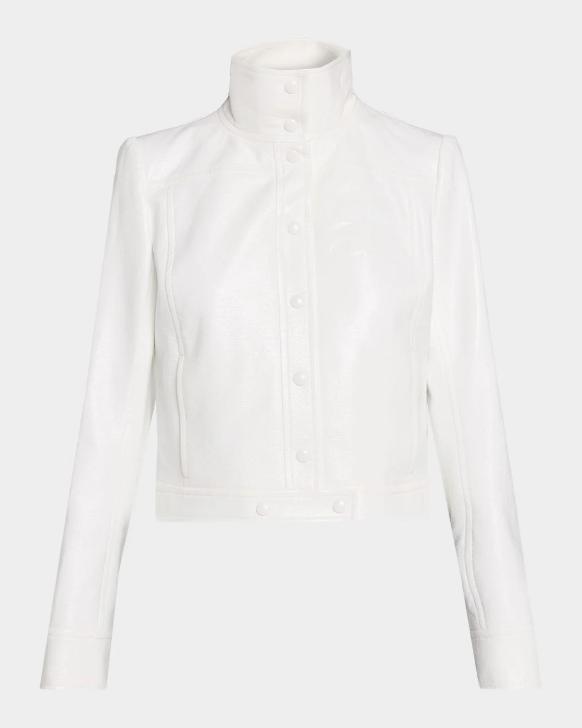 Courreges textured vinyl jacket featuring contrast logo patch chest Part of the Iconic vinyl collection Approx. 19"L from shoulder to hem; 25.2" sleeve length Spread collar; snap front Long sleeves Side slip pockets Straight fit Cropped length Cotton Cupro, lining Imported