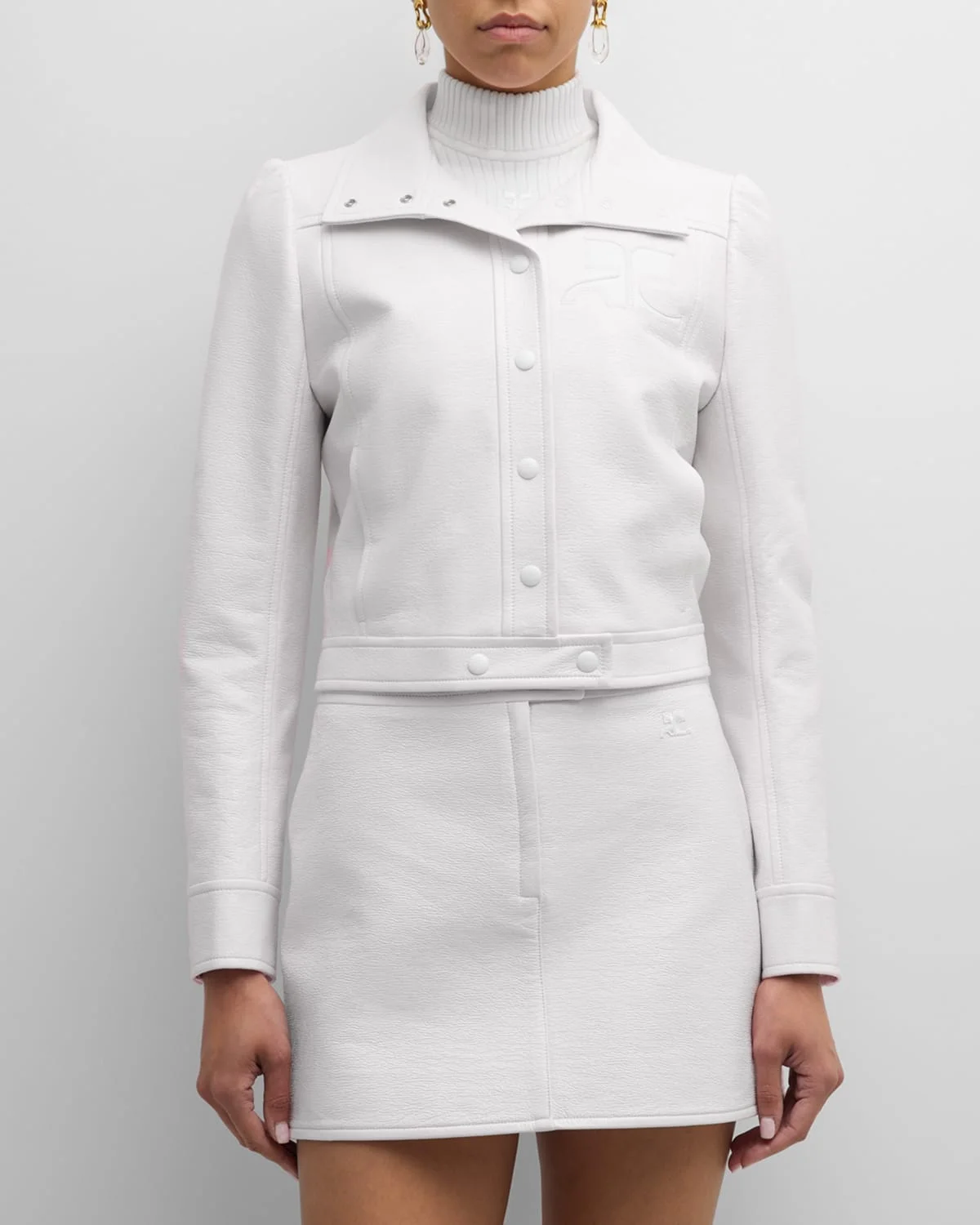 - Courreges textured vinyl jacket featuring contrast logo patch chest - Part of the Iconic vinyl collection - Approx. 19"L from shoulder to hem; 25.2" sleeve length - Spread collar; snap front - Long sleeves - Side slip pockets - Straight fit - Cropped length - Cotton - Cupro, lining - Imported - Model is 5'10"/177cm.