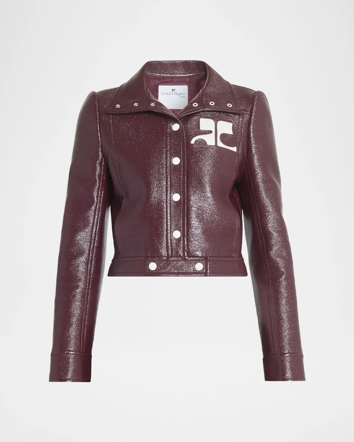 Courreges textured vinyl jacket featuring contrast logo patch chest Part of the Iconic vinyl collection Approx. 19"L from shoulder to hem; 25.2" sleeve length Spread collar; snap front Long sleeves Side slip pockets Straight fit Cropped length Cotton Cupro, lining Imported