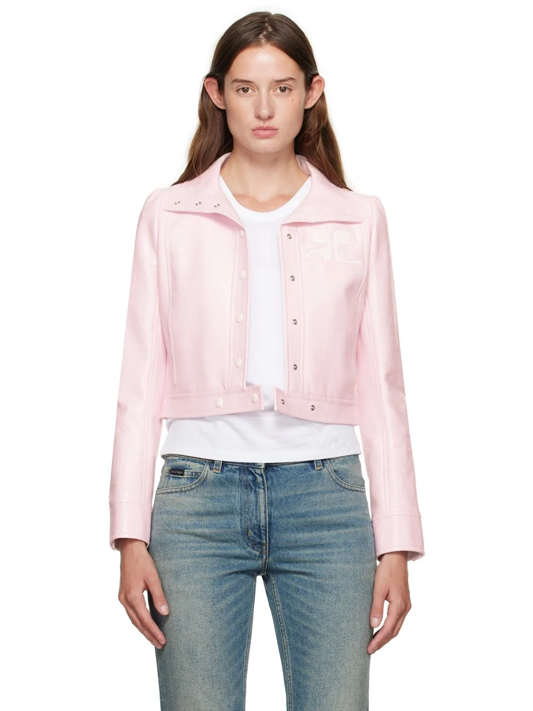 Crinkled coated vinyl jacket. · Stand collar · Press-stud closure · Logo applique at chest · Welt pockets at waist · Cropped hem · Press-stud barrel cuffs · Welt pocket at interior · Full satin lining Part of the Reedition collection. Supplier color: Pale Pink Body: 88% cotton, 10% polyurethane, 2% elastane. Lining: 100% cupro. Made in Slovakia (Slovak Republic) 252783F063007