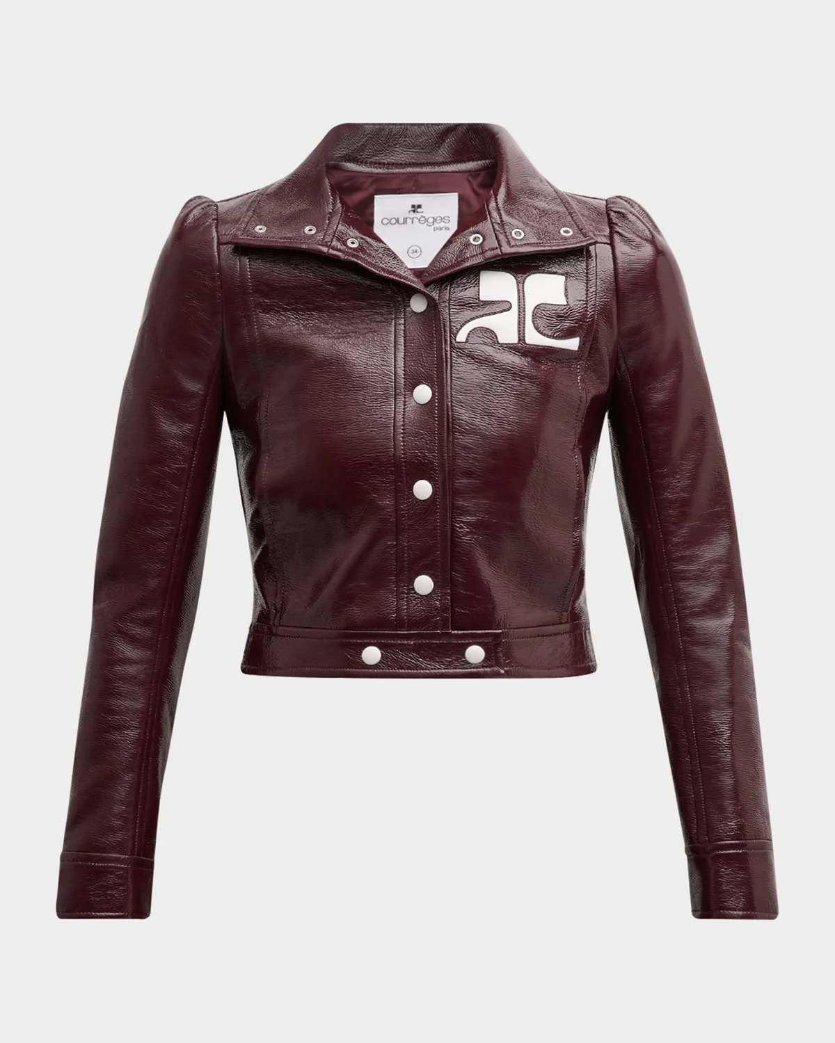 - Courreges textured vinyl jacket featuring contrast logo patch chest - Part of the Iconic vinyl collection - Approx. 19"L from shoulder to hem; 25.2" sleeve length - Spread collar; snap front - Long sleeves - Side slip pockets - Straight fit - Cropped length - Cotton - Cupro, lining - Imported - Model is 5'10"/177cm.