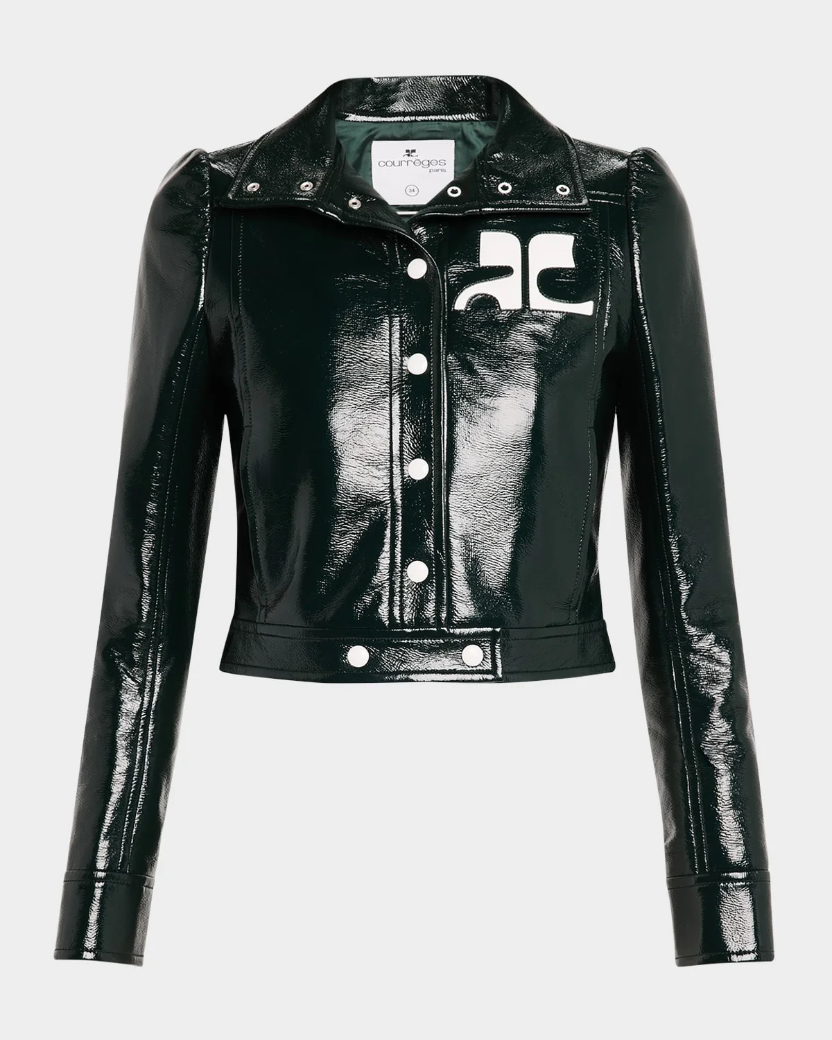 - Courreges textured vinyl jacket featuring contrast logo patch chest - Part of the Iconic vinyl collection - Approx. 19"L from shoulder to hem; 25.2" sleeve length - Spread collar; snap front - Long sleeves - Side slip pockets - Straight fit - Cropped length - Cotton - Cupro, lining - Imported - Model is 5'10"/177cm.