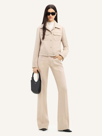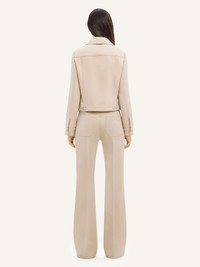 Long-sleeve signature twill Trucker jacket with button closure and AC logo at bottom. Front patch and welt pockets. The model is 1.78m tall and wears a size 36. DETAILS Composition: 83% polyester, 17% acetate Country of Manufacture: RS SKU: VESCBL002PL00071007 Color: Sand