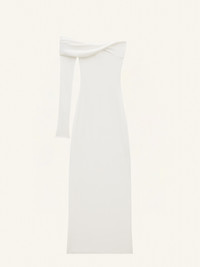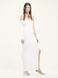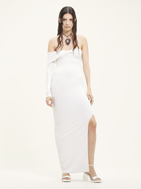 This asymmetrical long crepe dress has a twist on the front and a side slit. DETAILS Composition : 95% Viscose, 5% Elasthanne Pays de fabrication : France Couleur : Blanc Heritage Code Article : 124JRO350JS0115