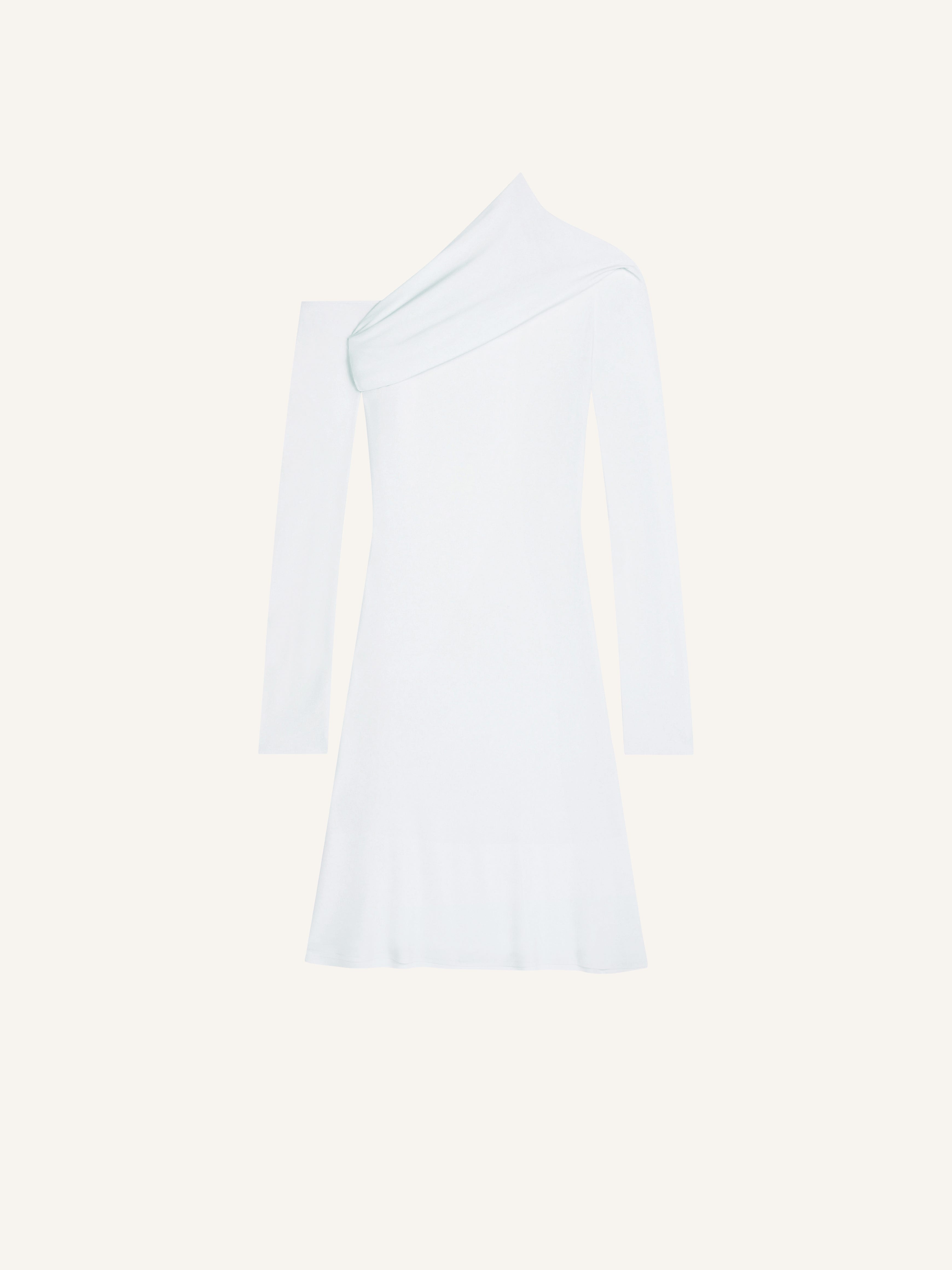 Long-sleeved asymmetrical trapeze mini dress in crepe jersey. Off shoulder and draped at the chest. The model is 1.76m tall and wears a size 36. DETAILS Composition: 95% viscose, 5% elastane Country of Manufacture: PT SKU: 324JRO449JS01457021 Color: Iceberg
