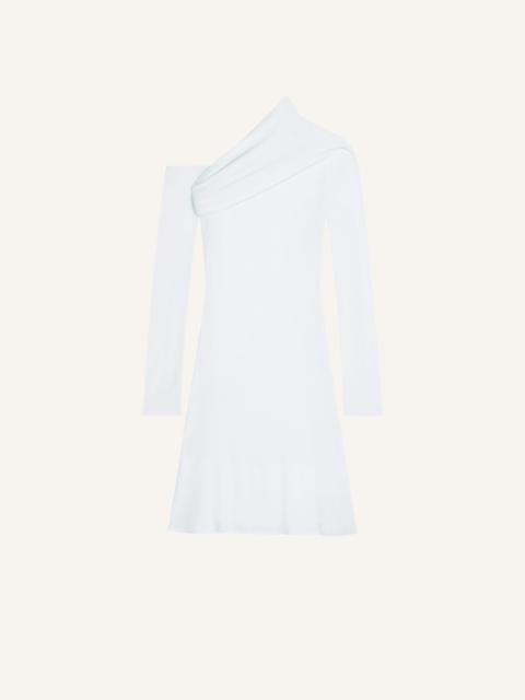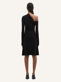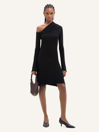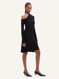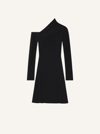 Long-sleeved asymmetrical trapeze mini dress in crepe jersey. Off shoulder and draped at the chest. The model is 1.76m tall and wears a size 36. DETAILS Composition: 95% viscose, 5% elastane Country of Manufacture: PT SKU: 324JRO449JS01459999 Color: Black