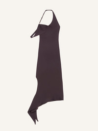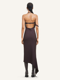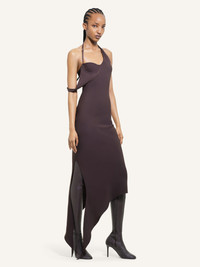Long sleeveless fitted crepe dress, undressed effect. Asymmetrically exposed bra cup. Slit on the side and bare back. The model is 1.75m tall and wears a size 36. DETAILS Composition: 70% polyester, 30% recycled polyester Country of Manufacture: IT SKU: 424CRO510PL01471983 Color: Chocolate