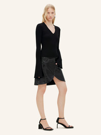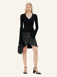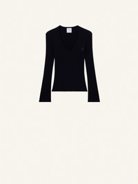 Rib knit V neck sweater with embroidered AC logo at the chest. Long flared sleeves. The model is 1m75 tall and wears a S size. DETAILS Composition: 70% viscose, 30% polyester Country of Manufacture: BG SKU: 224MPU162FI00019999 Color: Black