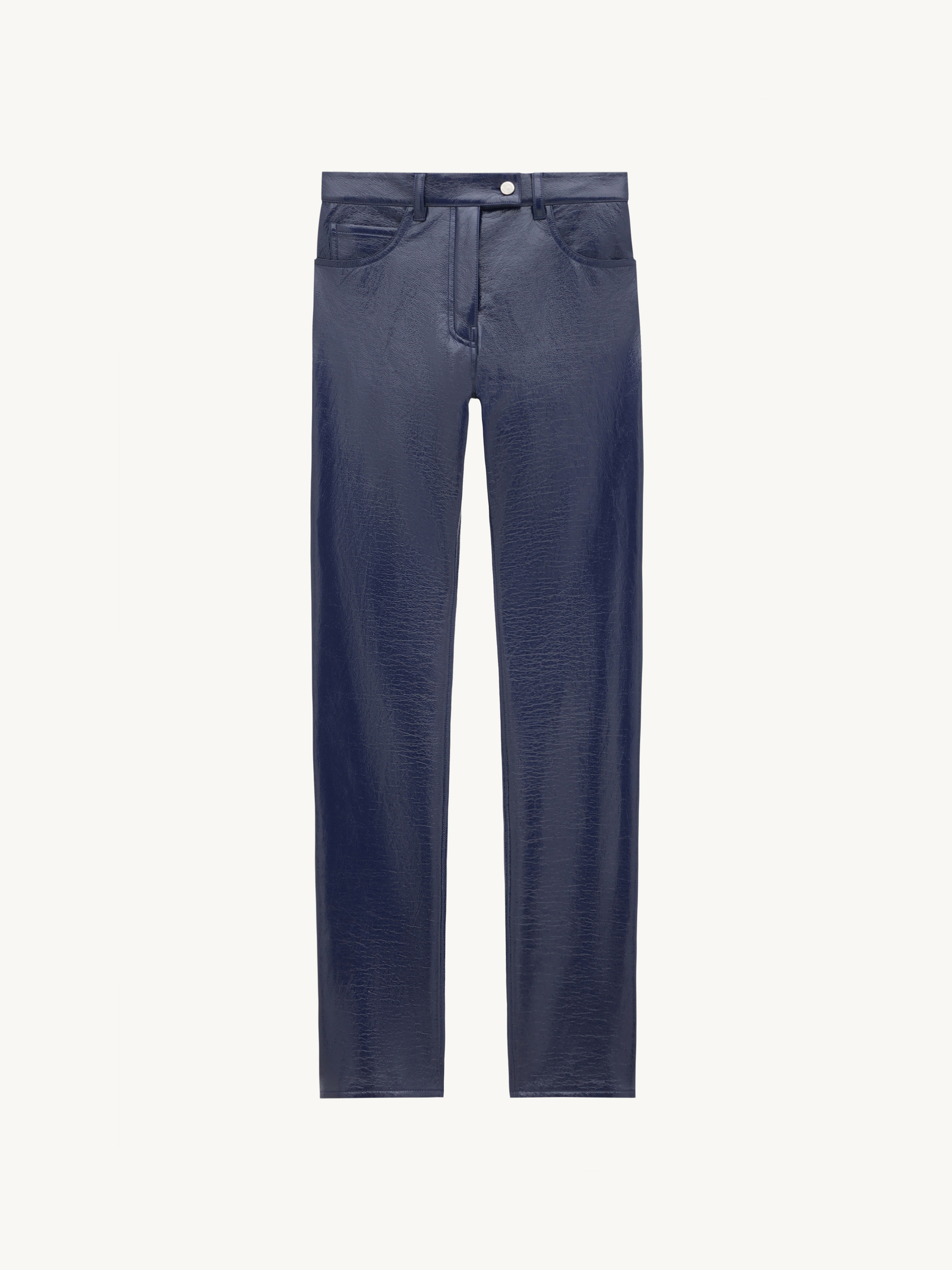 Straigh fit iconic vinyl pants with 5 pockets and embroidered logo with metallic snap. DETAILS Composition: 88% Cotton 10% Polyurethane 2% Elastane Lining: 100% Cupro Color: Ink Country of manufacture: Serbia Item code: 123CPA013VY00147077