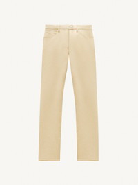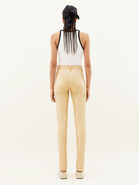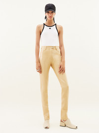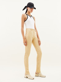 Vinyl pants with tone-on-tone logo on the back pocket. Closure fly style Courrèges with zip and lacquered pressure. Two Italian pockets on the side, two patch pockets on the back. Model not lined. DETAILS Main fabrics : 88% Cotton 10% Polyurethane 2% Elastane Made in : Serbia Color : Sand Item code : 122CPA013VY00031007
