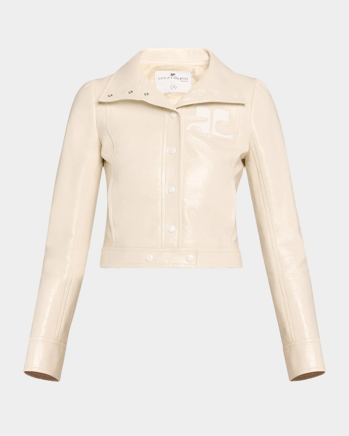 Courreges vinyl reedition jacket featuring logo front Spread collar; snap front Long sleeves; snap cuffs Side slip pockets Slim fit Cotton/polyurethane/elastane Lining: Cupro Imported