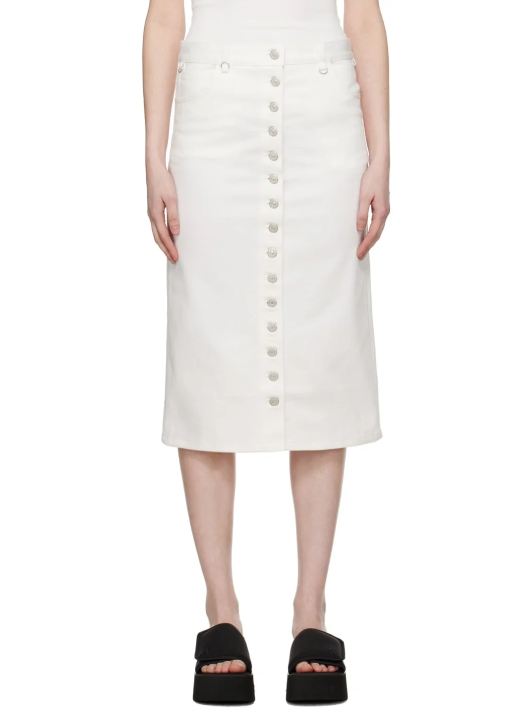 Stretch denim skirt. · Belt loops · O-ring hardware at waistband · Five-pocket styling · Button closure · Logo embroidered at back pocket · Central vent at back hem · Partial cotton twill lining · Logo-engraved silver-tone hardware Supplier color: Heritage white Body: 99% cotton, 1% elastane. Lining: 100% cotton. Made in Italy 241783F092000