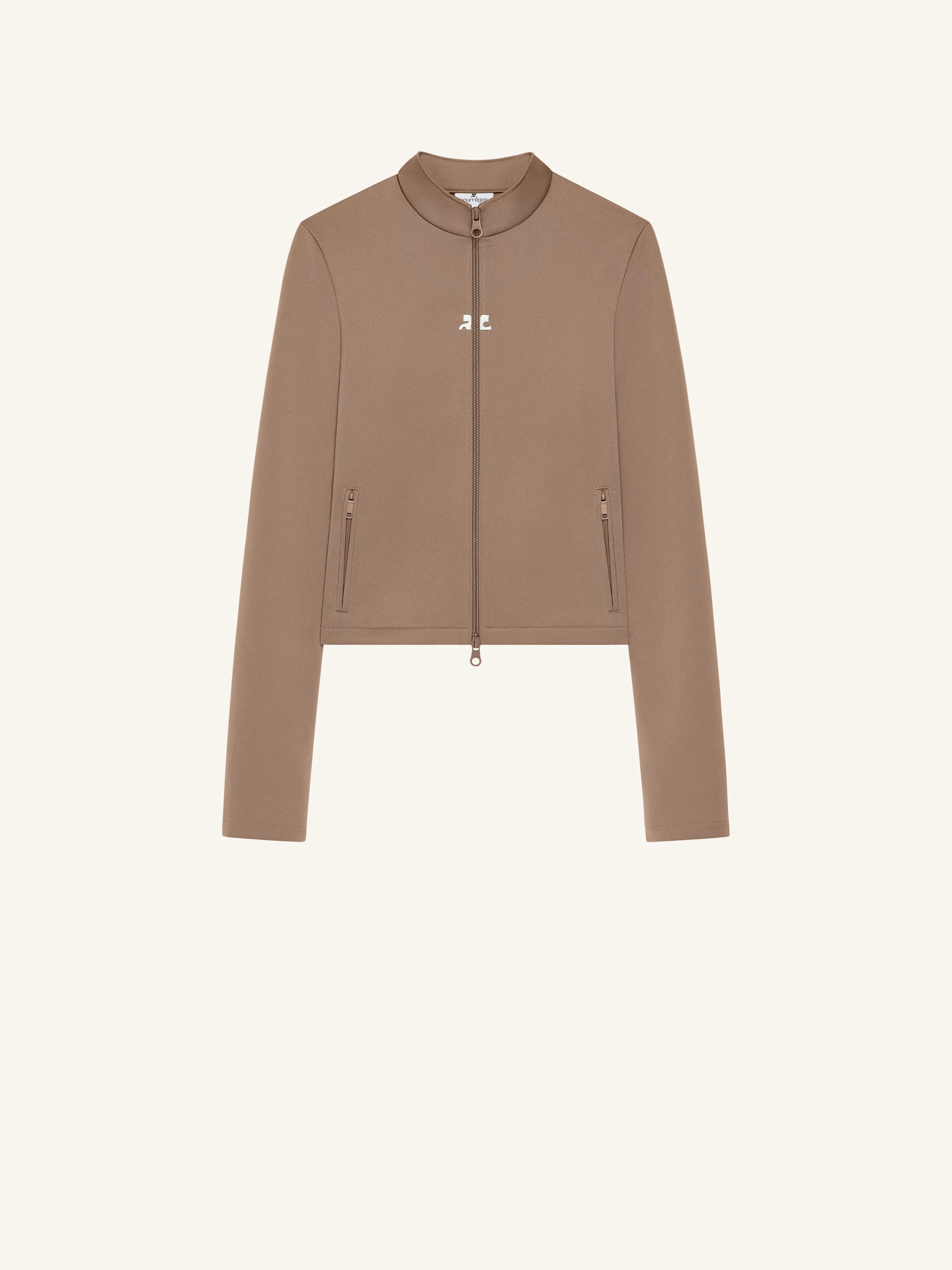 Biker tracksuit jersey jacket with zipped pockets and embroidered AC logo at center chest. The model is 1.77m tall and wears a size S. DETAILS Composition: 100% polyester Country of Manufacture: IT SKU: 325JVE133JS02501098 Color: Mocha