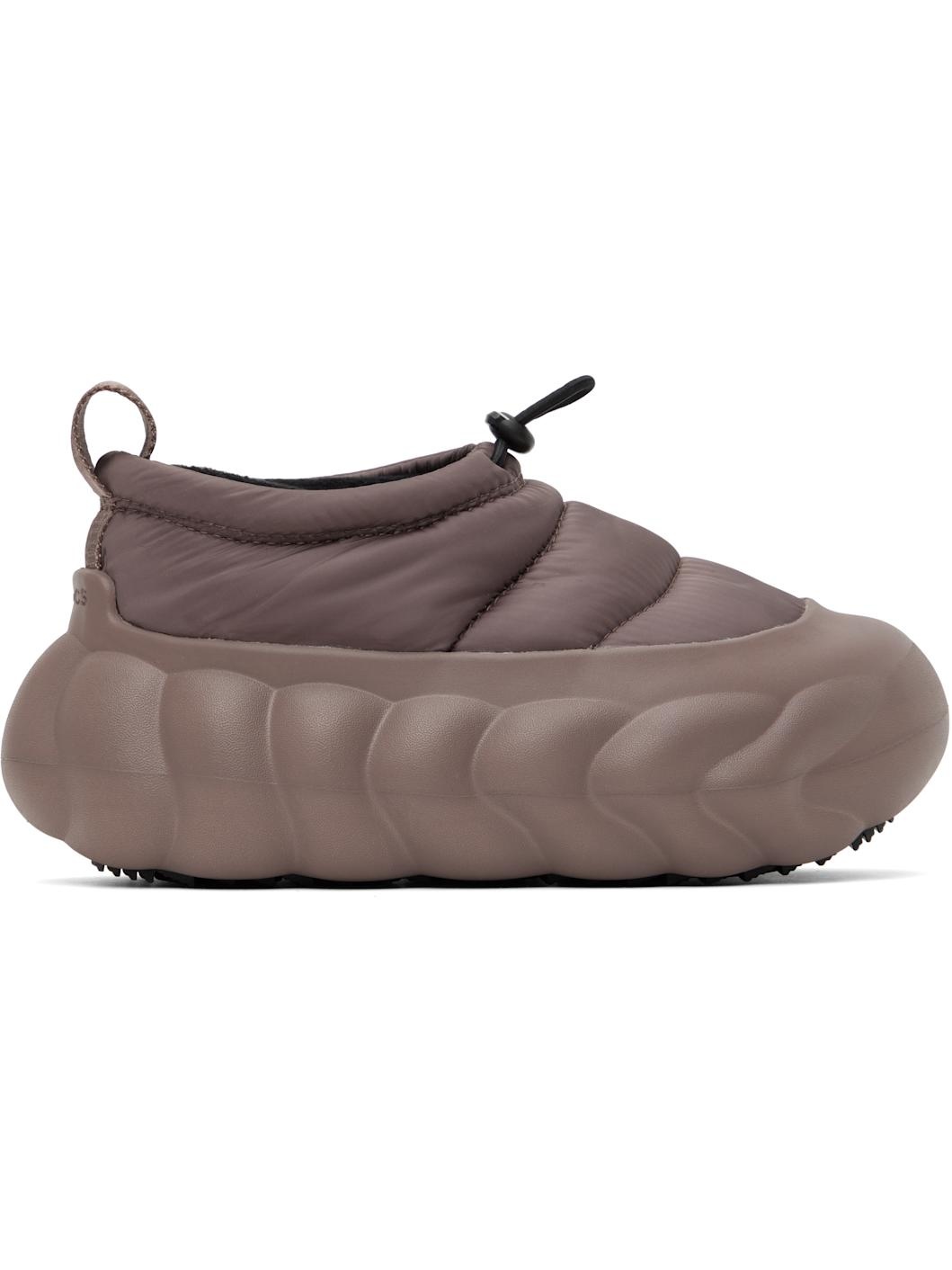 Quilted satin loafers in brown. · Rubber cap toe · Bungee-style drawstring at vamp · Pull-loop at heel collar · Logo embossed at heel counter · Fleece lining · Sculptural rubber platform midsole · Treaded rubber sole · Platform: H3" Supplier color: Truffle Upper: textile. Sole: rubber. Made in China 251209F121032