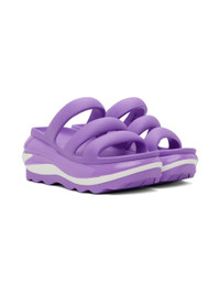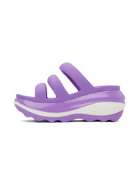 Croslite™ rubber slip-on flat sandals in purple. · Open toe · Padded straps at vamp · Logo-embossed outer side and heel · Molded rubber footbed · Sculptural platform rubber midsole · Treaded rubber sole · Platform: H3" Supplier color: Galaxy Rubber. Made in Viet Nam 242209F124004