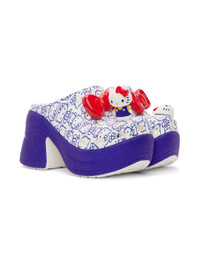 Lightweight foam rubber slip-on heels in white and blue. · Logo printed throughout · Open toe · Bow appliqué at vamp · Perforations at vamp · Molded footbed · Glittered treaded platform rubber sole · Platform: H1.5" · Heel: H3.5" Part of the Crocs Hello Kitty’s 50th Anniversary capsule collection. Supplier color: White