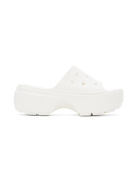 Lightweight Croslite™ rubber slip-on flat sandals in white. · Open toe · Perforated detailing at vamp · Logo-embossed vamp and heel counter · Molded rubber footbed · Textured platform rubber midsole · Lugged rubber sole · Platform: H2.75" Supplier color: Chalk Rubber. Made in Viet Nam 242209F124012