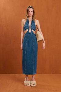 Preorder - Estimated Ship Date Between August 19th and September 2nd A midi length denim halter dress with side waist cut outs and an open back. — Made from denim — Flattering seam details throughout — Midi length — Plunge bust connected with gold hardware. FIT NOTES Model is 5'11" and is wearing a size 0 COMPOSTION AND CARE 100% COTTON