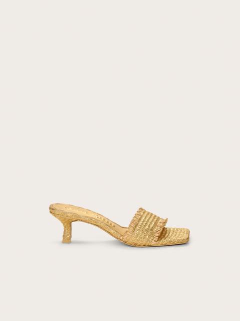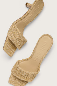 A square-toed open sandal in natural knit straw with a curved kitten heel. — Natural knit straw — Comma-heel — Rubber sole — Square toe SIZE & FIT NOTES Heel Height: 2" Please note — Upper runs a little wide COMPOSITION AND CARE Upper: 100% Polyethylene Sole: 100% Rubber Heel: 100% ABS Wrapped In Polyethylene