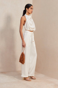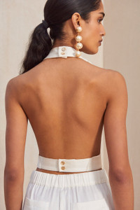 Embodying everyday elegance, this staple silhouette has a drapey, high cowl neck with a bare-all open back. This unlined hammered satin halter connects with a strap behind the neck and a strap at the waist with gold-toned buttons. Wear with the Minaya Pant for an ultra-chic monochromatic look. FIT NOTES Model is 5'9" and is wearing a size Small Cowl neck Back strap Unlined Strap at waist with button COMPOSTION AND CARE 98% Polyester, 2% Elastane