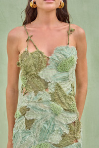 A full length gown crafted from viscose georgette with beads and raw edge details for added texture. — Objet d'art — Viscose georgette with beads — Delicate — Raw edges