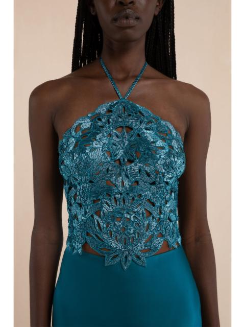 A long sleeve denim crop top with structured panels and a center bust held together by gold toned hardware. — Cropped length — Denim panels — Joined at bust by gold hardware — Wear with the Mia Jean Skirt for a complete set SIZE & FIT NOTES Model is 5'10" and is wearing a size Small COMPOSITION AND CARE 100% COTTON