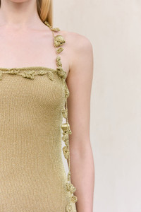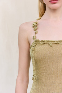 A metallic knit mini dress with a square neckline and crochet flower details. — Mini length — Metallic knit — Slight stretch — Lined — Crochet flower details