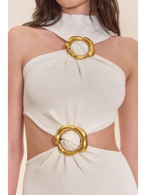 A midi-length knit dress with gold-toned hardware, a high neck design, and side cutouts. — Abstract gold-toned buckle hardware — Side cutouts at the neck and waist — Midi length — High neck COMPOSITION AND CARE 65% VISCOSE 35% NYLON