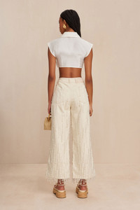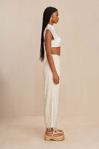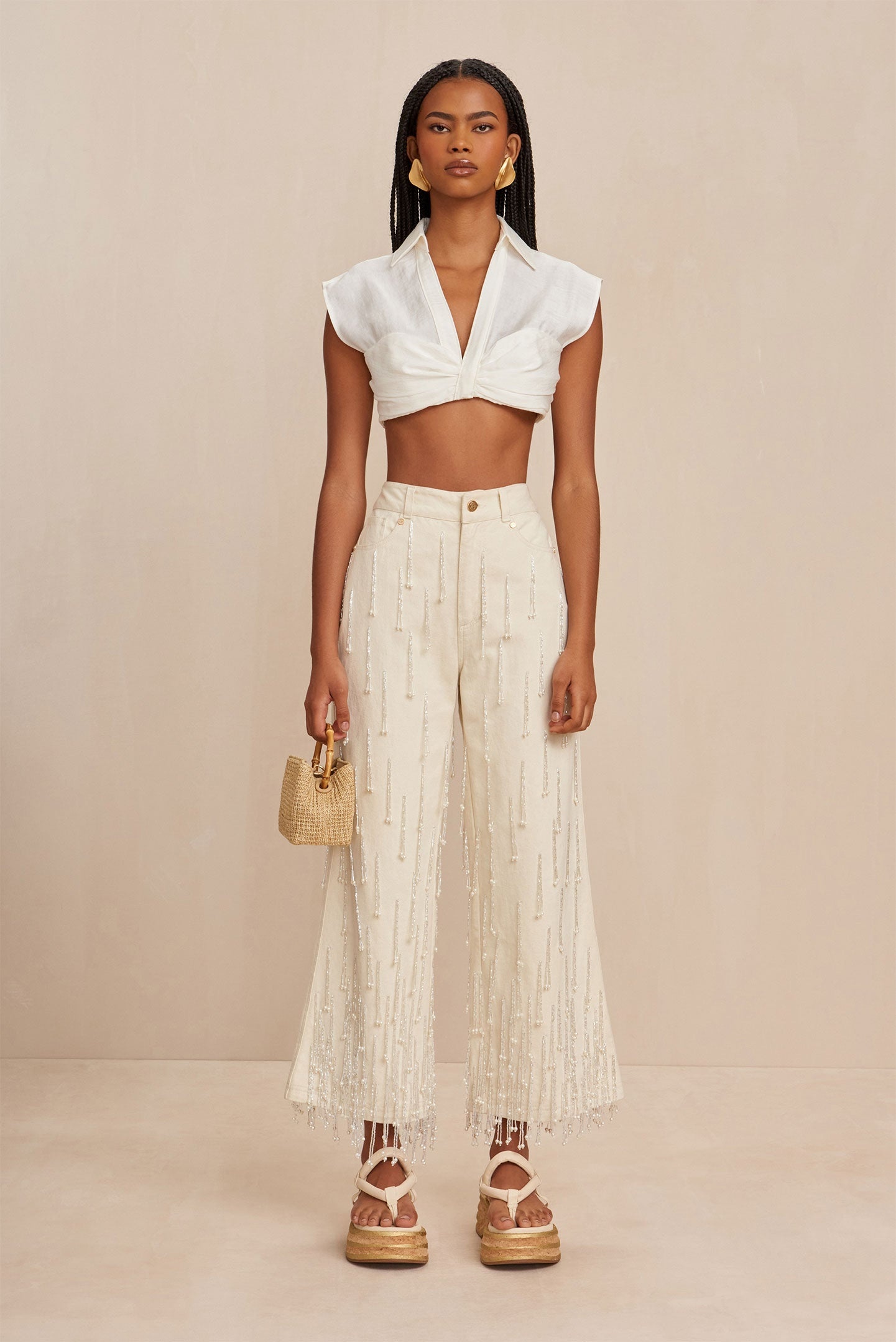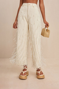 Preorder - Estimated Ship Date Between June 3rd to June 17th A wide-leg, cropped denim pant featuring layered double beaded, shimmering tassels throughout. — Glass beaded tassel detailing throughout — Front and back pockets — High-waist fit — Gold-toned studs with CG signature — Button and zip fly closure — Wide, cropped leg FIT NOTES Model is 5'10" and is wearing a size 27 COMPOSTION AND CARE 100% COTTON