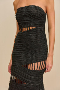 Turn heads with the Amiru Gown, a sculptural strapless gown hand crafted from waves of black raffia featuring paneled cutouts throughout the body. — Strapless — Maxi length — Hand crocheted raffia — Fitted silhouette SIZE & FIT NOTES Model is 5'10" and wearing a size 4 COMPOSITION AND CARE 100% POLYESTER DO NOT DRY CLEAN, HAND WASH COLD, LAY FLAT TO DRY, DO NOT SOAK, DO NOT WRING
