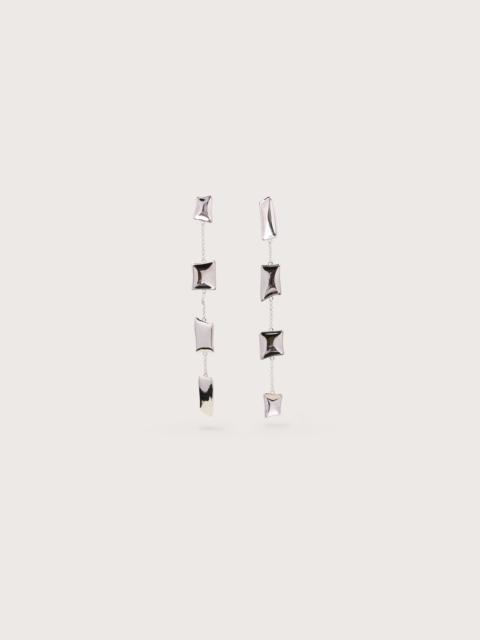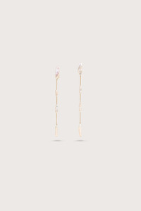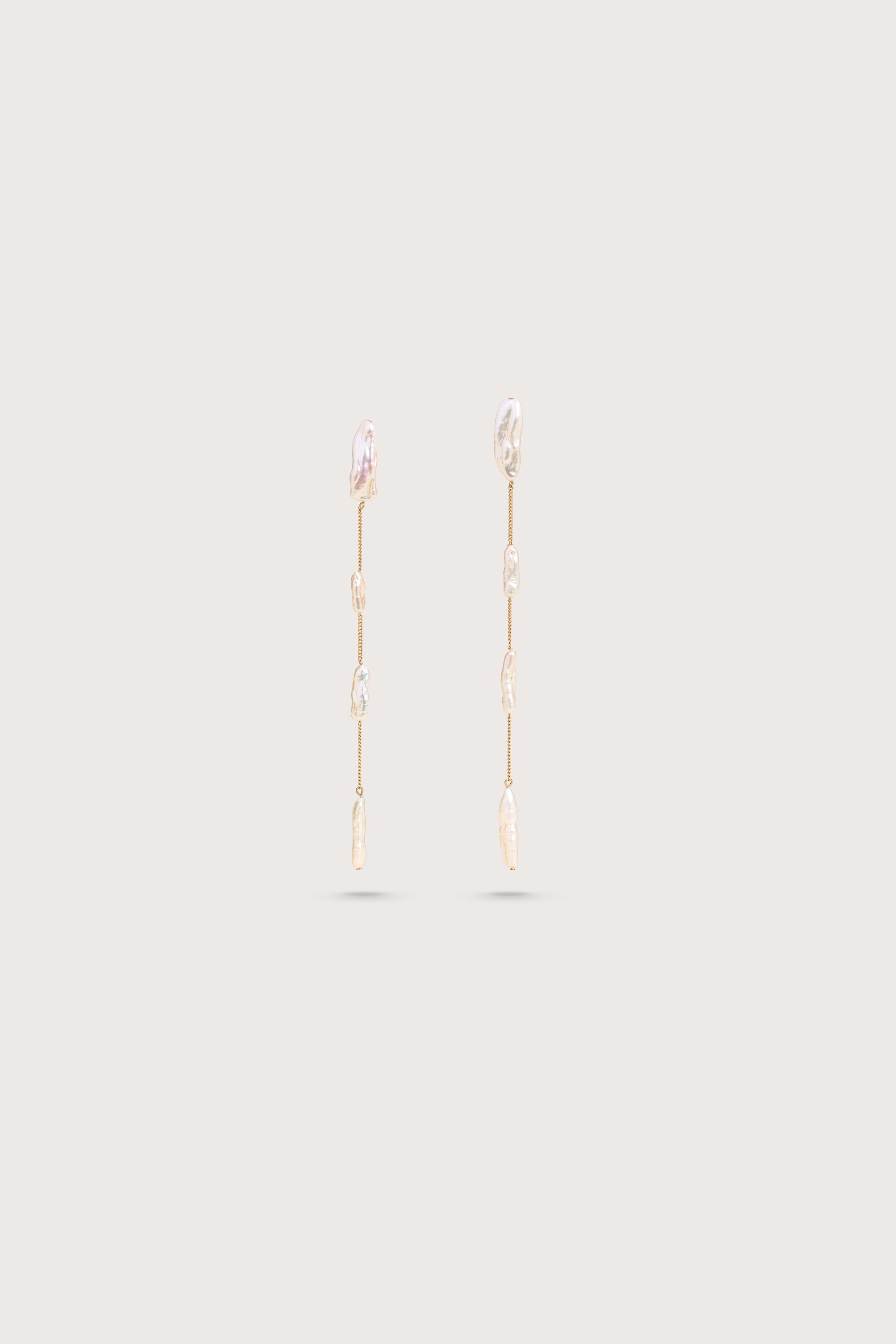 A delicate statement earring designed with geometric shaped natural Keshi pearls. — Drop earring — Keshi pearls FIT NOTES HEIGHT: 0.30" LENGTH: 5.5" COMPOSTION AND CARE 100% Brass Trim: Biwa Keshi Pearls